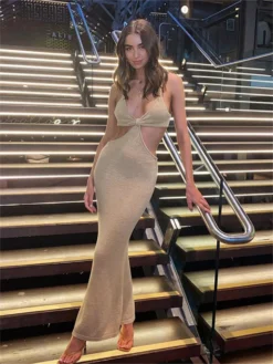 Women’s Long Slim Cocktail Dress Solid Color Sleeveless Round Neck Sheer Bodycon Dress